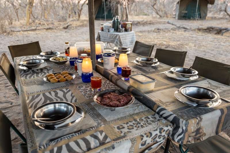Wide frame walk in mini meru tents to share (single on request – extra charges apply) One camp bed with mattress and all necessary bedding included per guest. Each tent has an ensuite ablution section with direct access from the tent, which includes a bucket shower and bush toilet, along with a small stand with mirror, bowl and jug for water. Two bed tent camping tent As we camp in wild areas, parks and game reserves that are completely wild and unfenced with no facilities or equipment, our teams set up a full camp including a mobile kitchen and dining area. Evening table dinner in forest